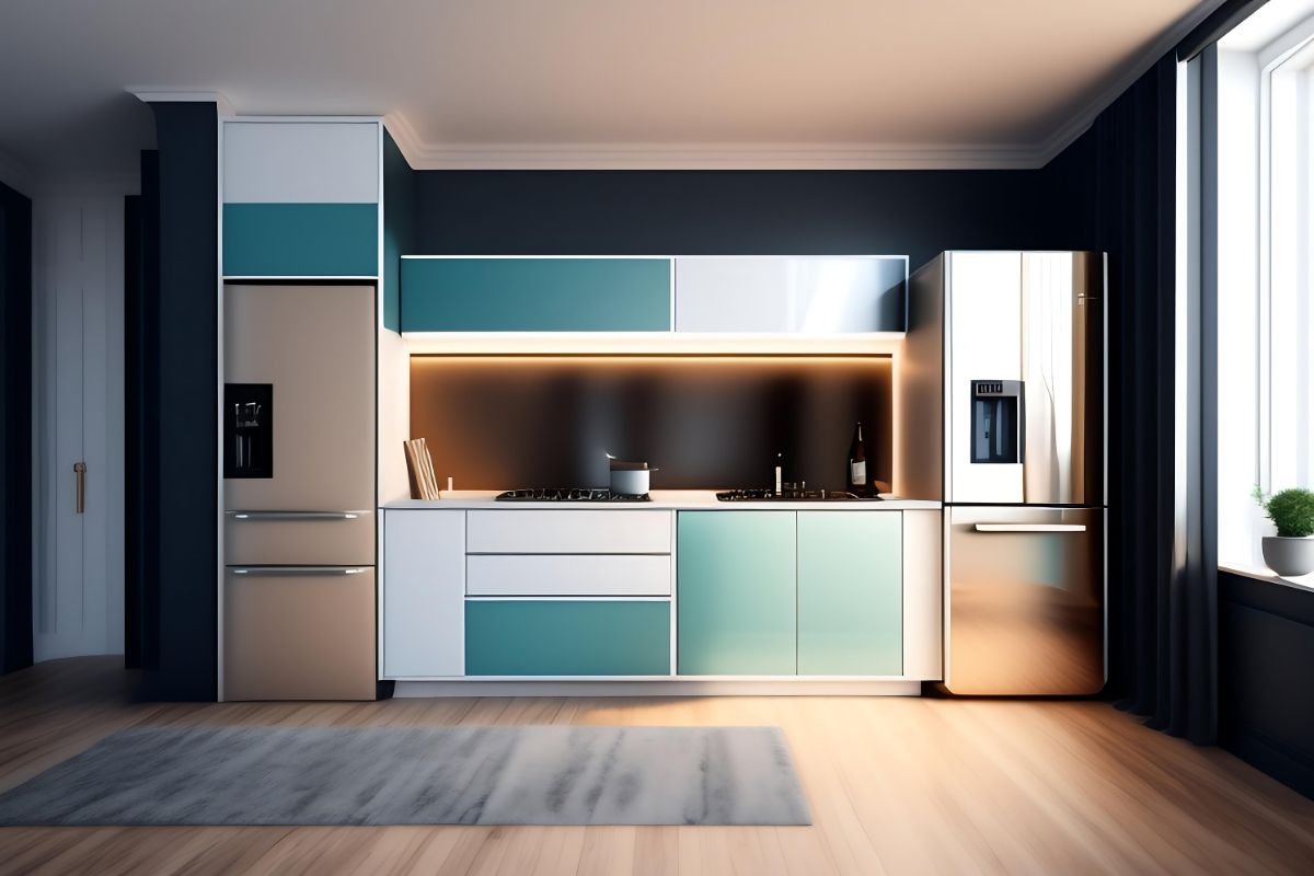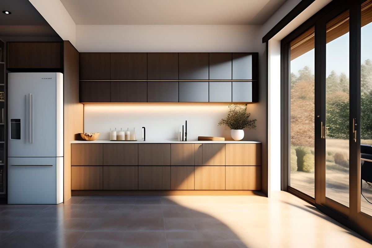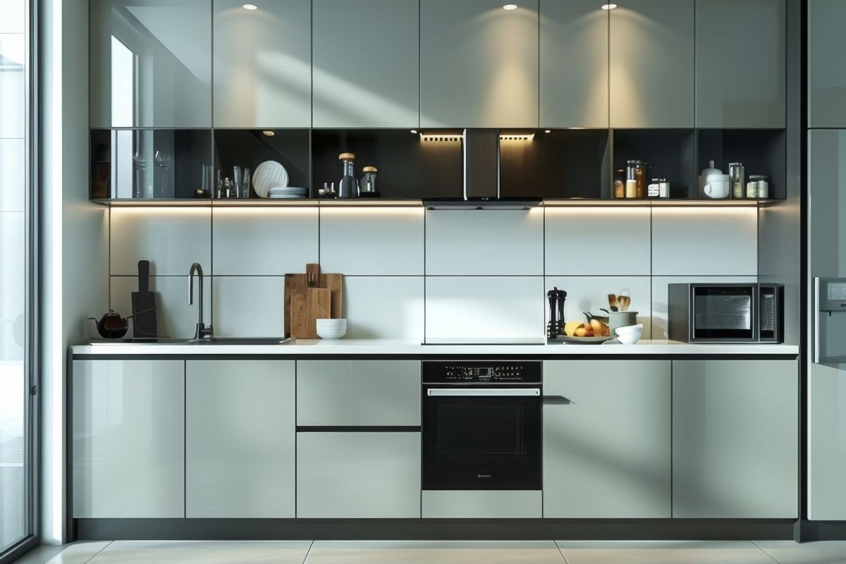 Reflective Finishes: Use high-gloss laminates or back-painted glass shutters to reflect light and make the kitchen wall appear more expansive.